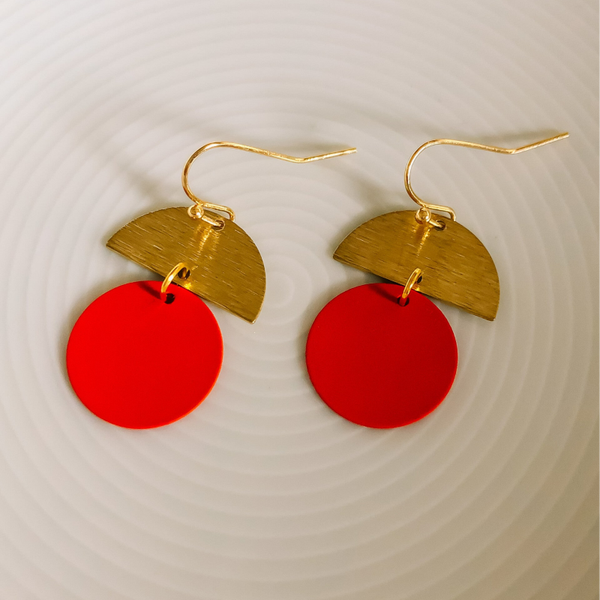 Goudkleurig oorhaakje en halve maan, met rood berubberd schijfje. Lengte: 4 cm