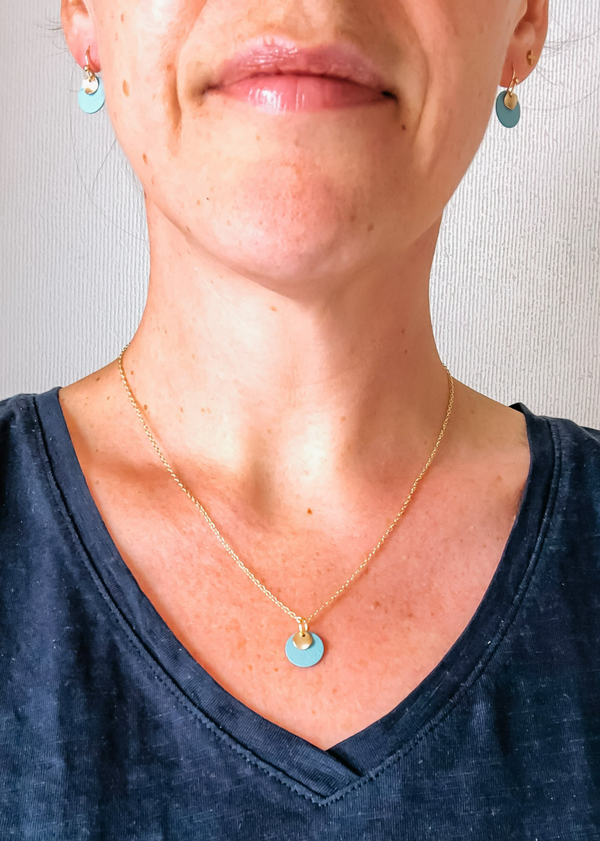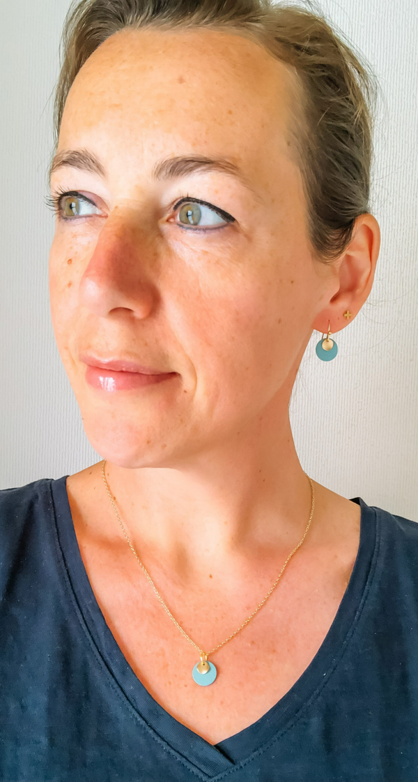Goudkleurige ketting met zeegroen oneffen schijfje en goudkleurig golvend schijfje.