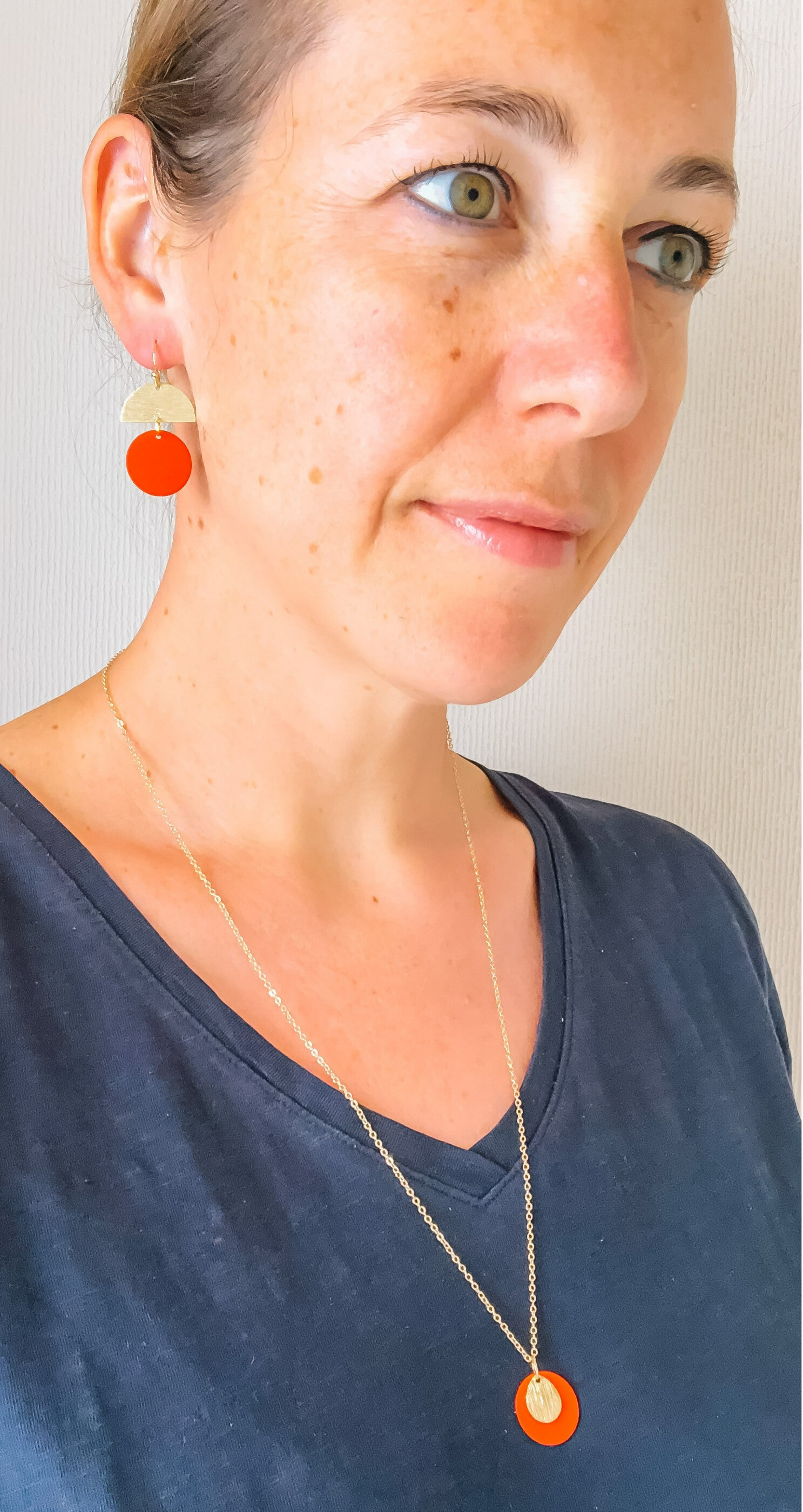 Goudkleurige ketting met rood berubberd hangertje en goudkleurige druppel.