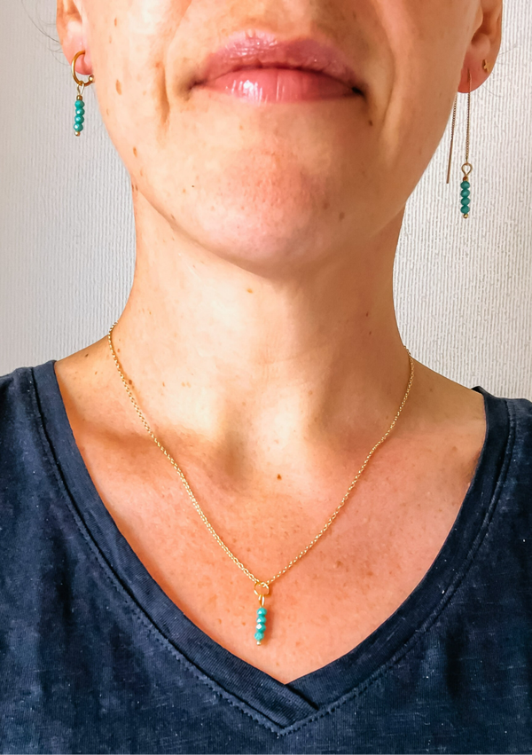 Goudkleurige ketting met kleine turquoise facetsteentjes.