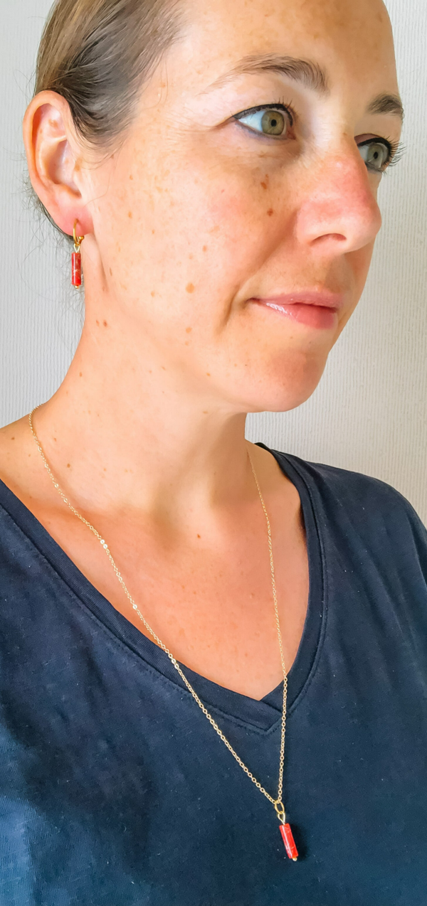 Goudkleurige ketting met rood wit gekleurde natuursteen.
