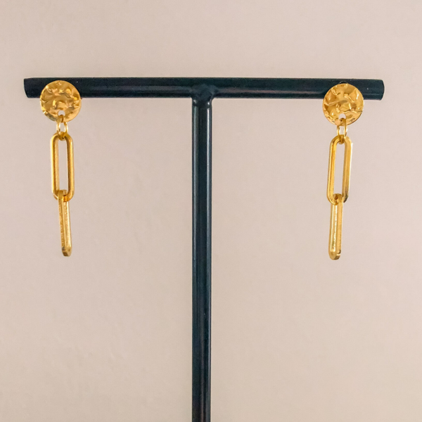Goudkleurige oneffen oorsteker met schakelhanger. Lengte: 3,5 cm