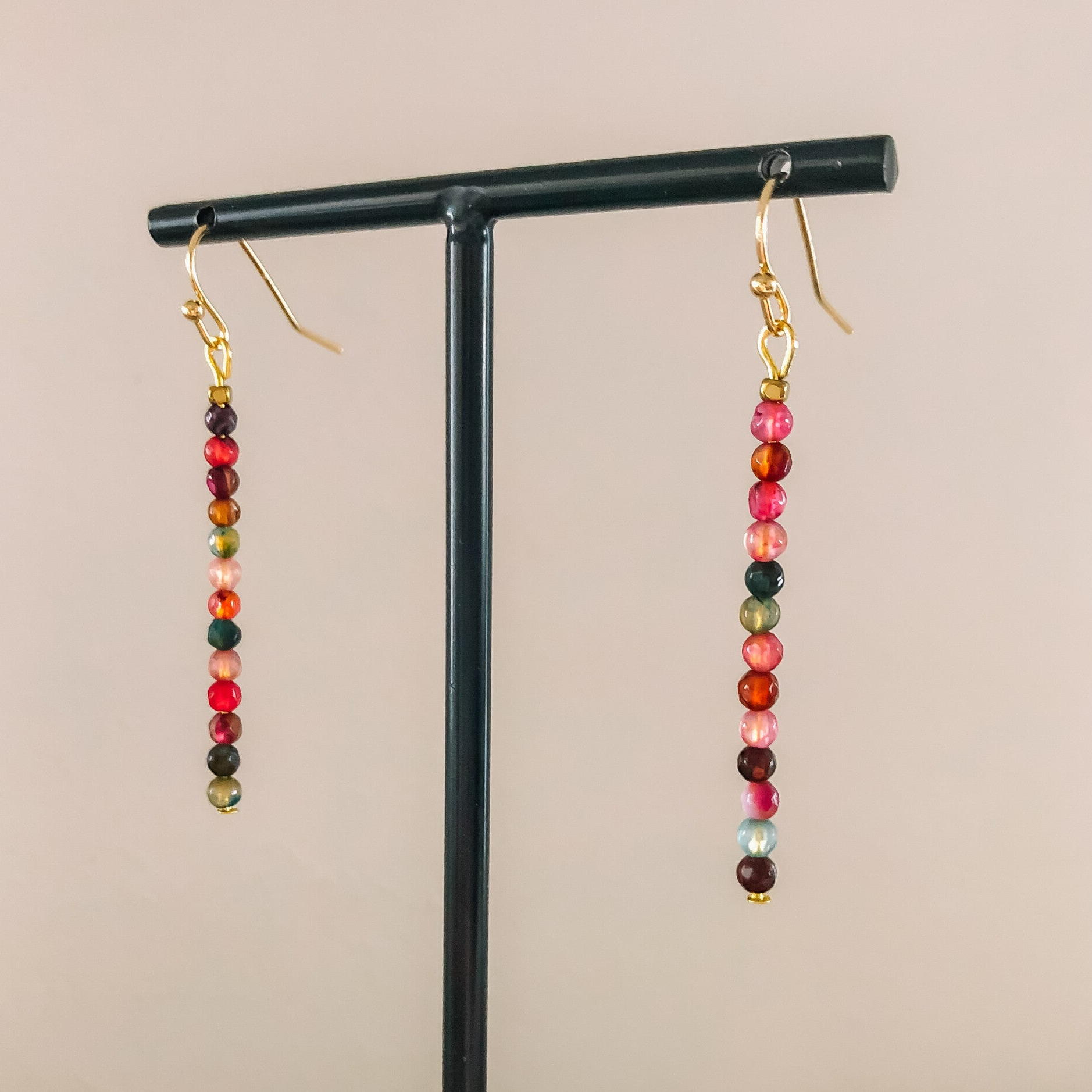 Goudkleurig oorhaakje met staafje van veelkleurige pareltjes. Lengte: 5,5 cm