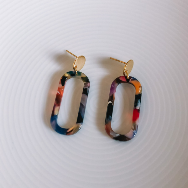 Goudkleurige oorsteker met ovalen bedel van meerkleurig resin. Lengte: 4 cm