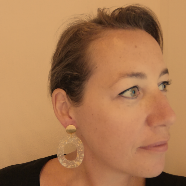 Ronde goudkleurige oorsteker (15 mm) en transparante resin met goud- en zilvervlokjes. Lengte: 6,5 cm