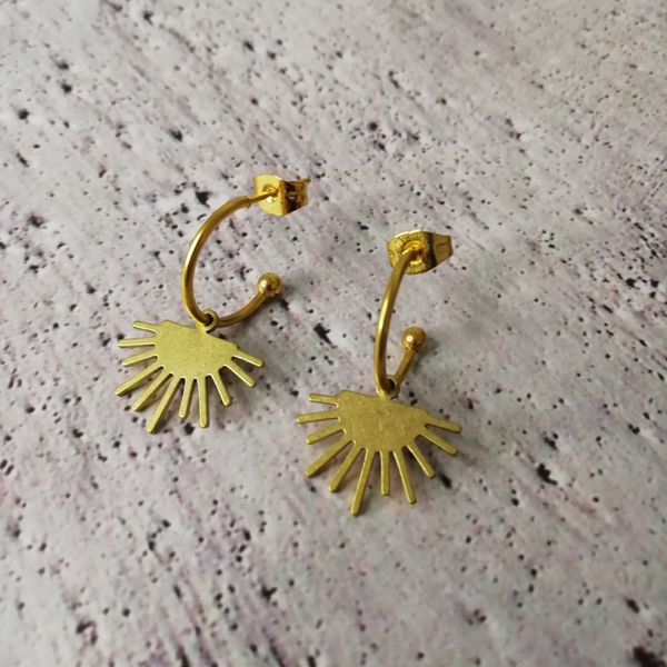 Goudkleurig open oorringetje met zonnige hanger. Lengte: 3 cm