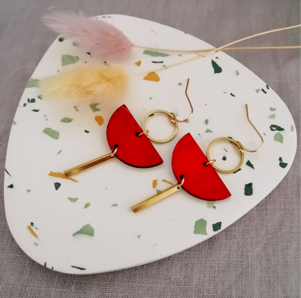 Goudkleurig oorhaakje, cirkel en staafje, met rode halve cirkel van hout. Lengte: 6cm