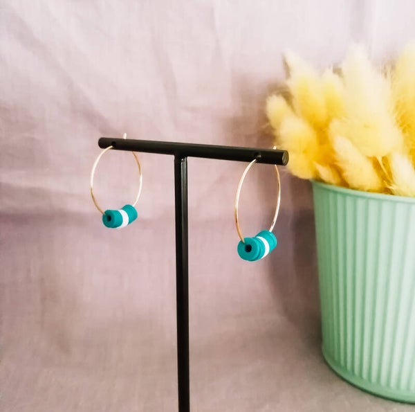 Goudkleurige creolen met witte en turquoise katsukikralen. Lengte: 2,5 cm