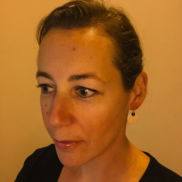 Goudkleurig oorhaakje en oneffen schijfje met zwart golvend schijfje. Lengte: 2,5 cm